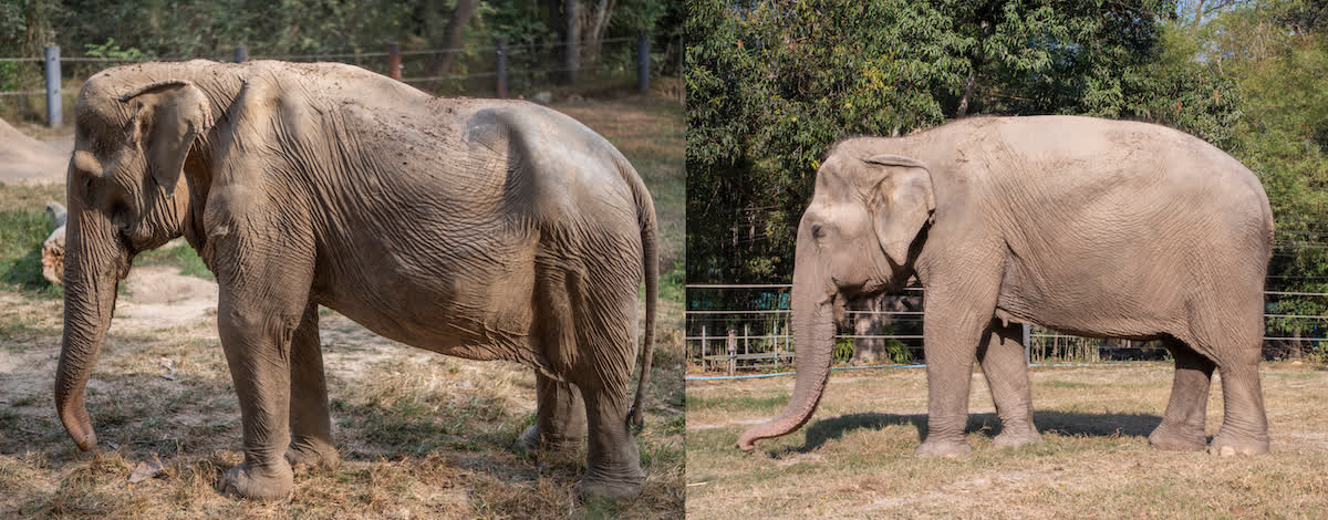 In the photo below, the elephant of the right is a forest elephant and looks as a healthy elephant should. The one of the left is an elephant forced to carry a platform full of tourists and a mahout, causing its back to sag.